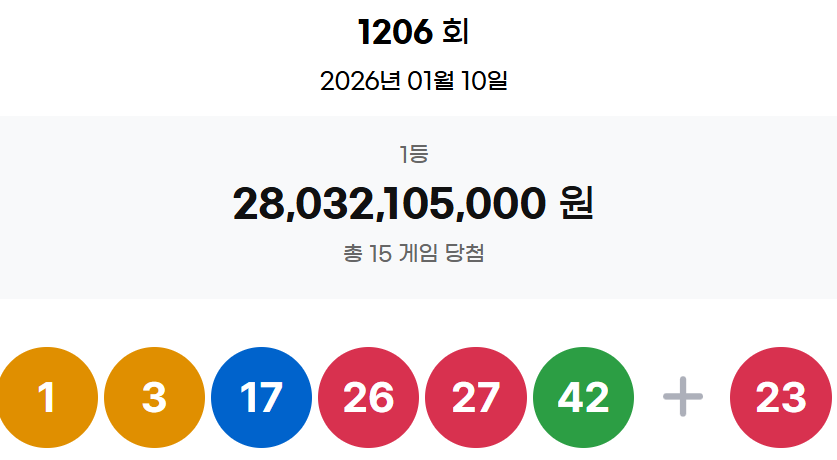 2026년 1월 10일 1206회 로또당첨번호 1등 2등 당첨지역 판매점
